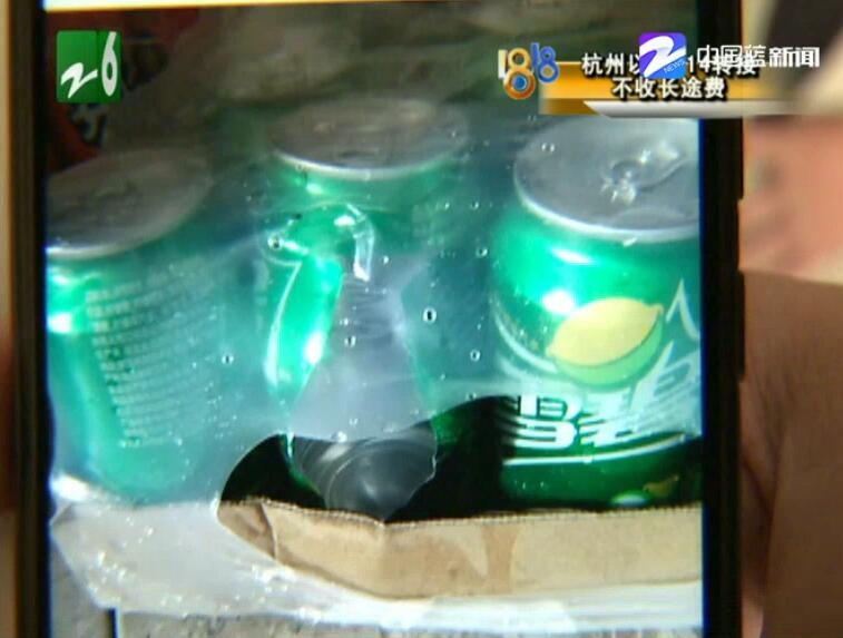 小刘是衢州人,在金华市区开了一家衢州郑妈妈小吃店,营业面积二十多平方,顺带卖些饮料。从照片上看到,一箱雪碧放在地上,塑料薄膜的外包装还没拆开,其中一罐雪碧的罐体破了很大一个洞。“批发商那边送过来的,放在地上两天了,当时室内开着空调,温度也不是很高,27度。”