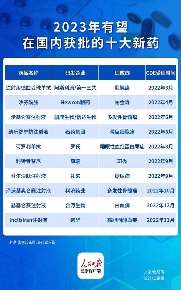 健康客户端依照国家药监局、各药企公告梳理,10款新药有望在2023年获批上市,包括抗体偶联药物(ADC)、siRNA疗法、CAR-T产品等多种类型药物。